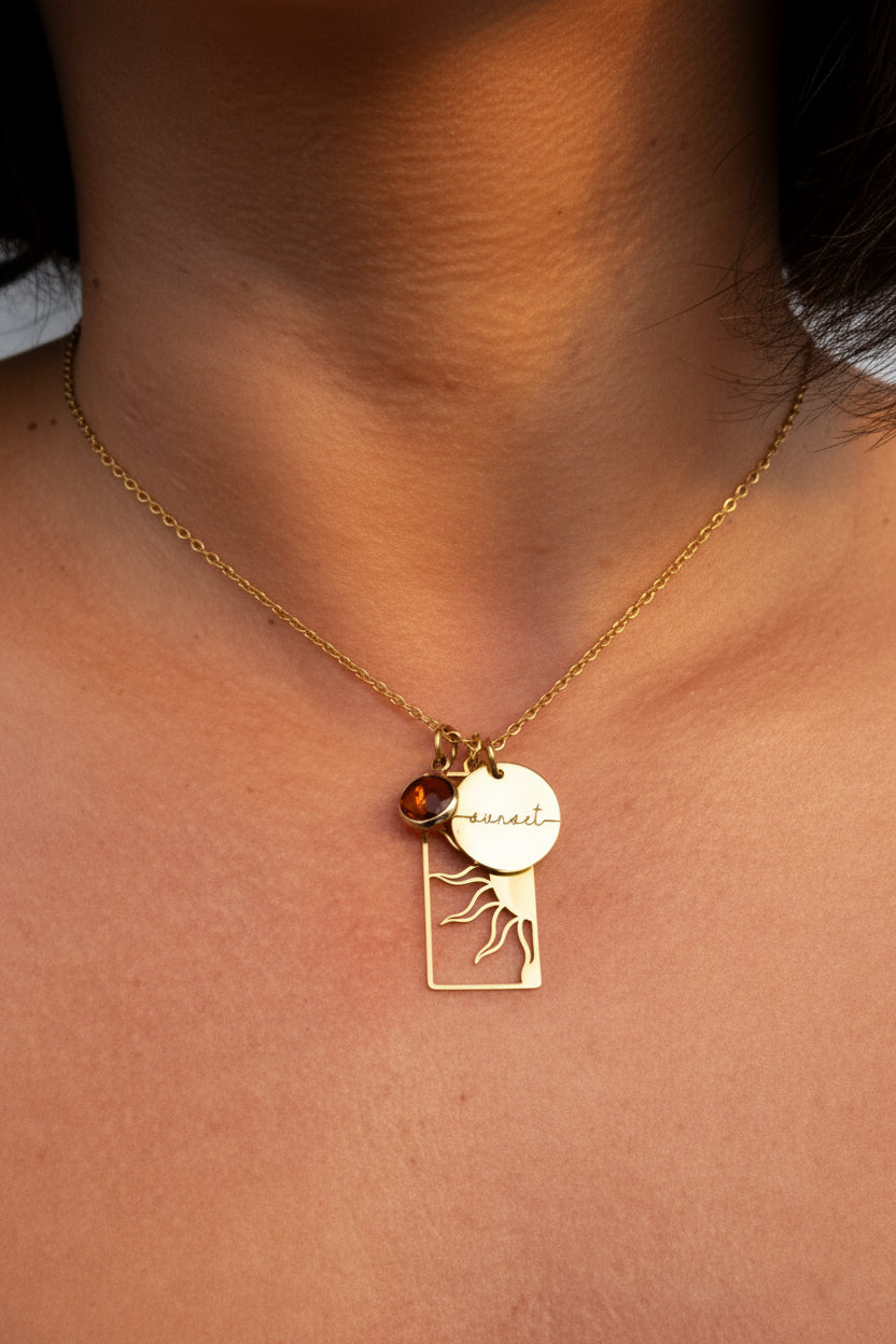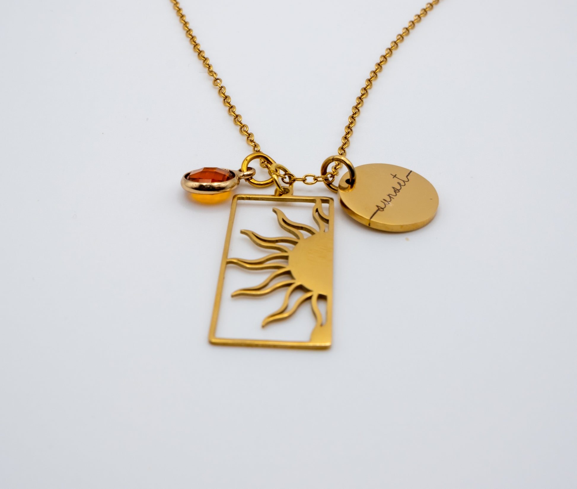 Experimenta la magia del atardecer con este collar que combina un sol y una medalla grabada con la palabra "Sunset". Confeccionado en acero inoxidable dorado, ofrece durabilidad y resistencia al agua, perfecto para tus momentos junto al mar. Su cierre de mosquetón y cadena extensible se adaptan a diferentes longitudes, brindándote versatilidad para cualquier ocasión. Un accesorio que captura la esencia del ocaso en cada uso.
